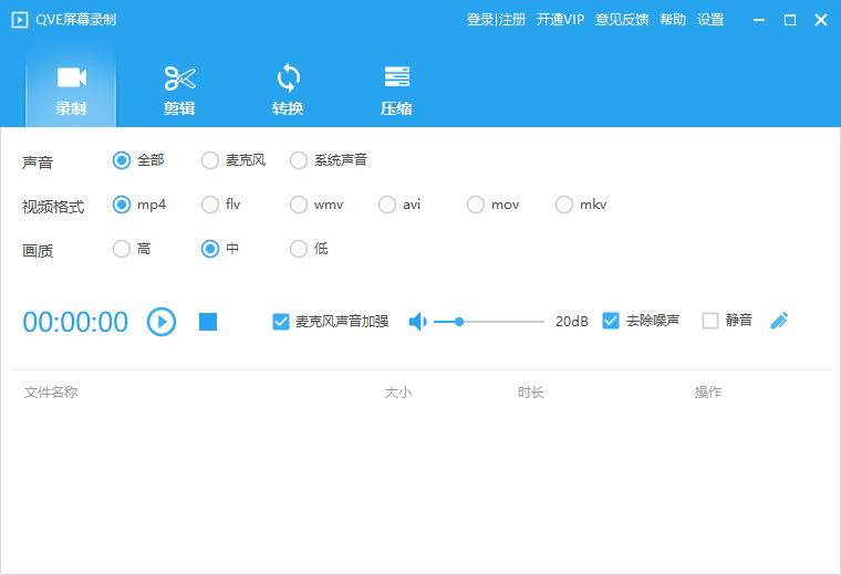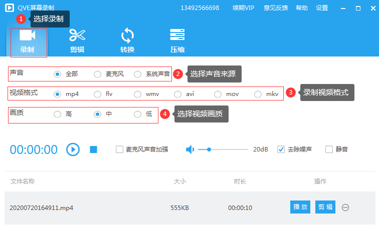 打开Qve屏幕录制软件,主界面选择【录制】,声音来源默认选择【全部】,【视频格式】默认mp4,选择录制的视频【画质】默认中。