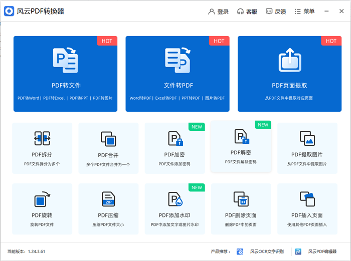 你还在为大量文件需要转换而烦恼吗?被领导要求批量转换大量文件而苦不堪言,今天,小编就带来了风云PDF转换器电脑版,能够有效的将PDF转换成Word或其他格式文档,支持把PDF转换成Word、演示文稿、Excel表格、RTF、HTML、文本和图像格式的文件,或选择部分区域转换文档;支持符合行业标准的PDF文档,支持各种常用的文件类型的PDF文档。同时针对标准排版的PDF文档,软件还可以一键拖入批量转换,另外支持文件夹拖入一键转换,支持批量转换。全新的风云PDF转换器具有高速、快捷、低错误率的特点,新增PDF合并拆分、PDF压缩、PDF页面提取等附加功能,最大精准度地保留所有原始数据和布局,有需要的用户可以在本站免费下载体验。