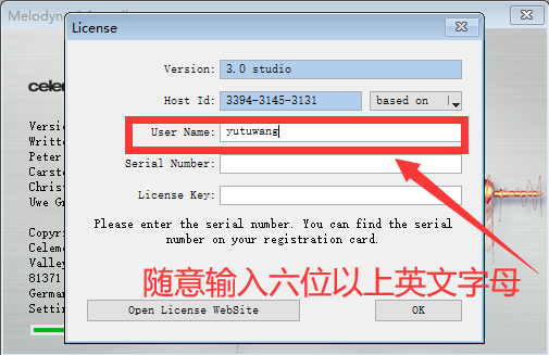 6、进入激活界面,在User Name中可随意输入6位以上的英文字母;