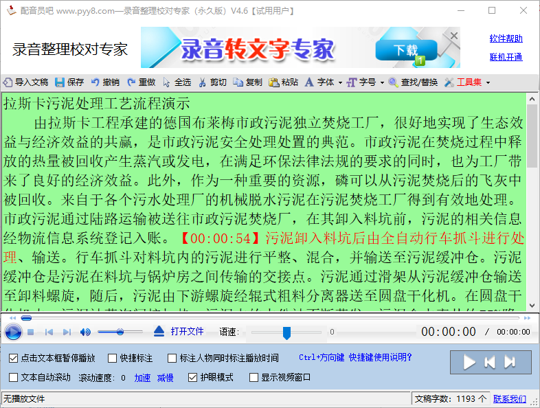 2、文稿校对功能,可实现文稿自动跟随语音进度滚动、快速暂停标注错误,并自动加入时间文稿编辑、排版、保存。