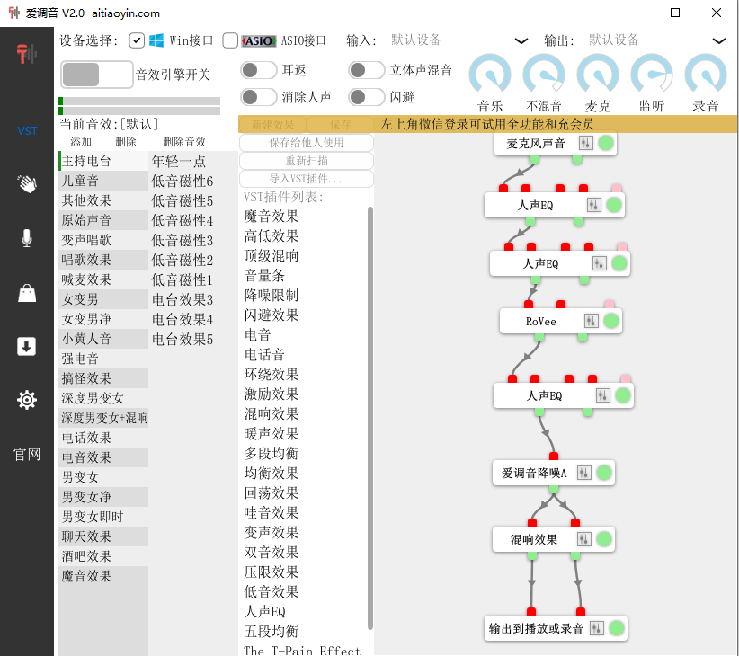 爱调音官方版是一款功能强大的声卡调试软件,通过它可以帮助用户轻松简单的对声卡进行调音处理,支持Windows接口和ASIO接口,内置顶级VST机架, 支持所有VST插件,还内置了几百种效果,是声卡调试的绝佳工具。软件拥有ASIO功能、VST机架功能、效果制作、录音、喝彩伴奏声、语音包快捷键、在线音效下载等多种功能,可以很好满足用户的各种需求。