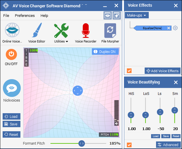 2、自定义假声:如果对预置的假声不满意,您也可以尝试修改参数,获得您专属的假声。(可参照下面的2、3、4部分)点击保存按钮,可以把您自己修改的假声保存为.nvc文件,供后续复用。点击加载按钮,可以加载一个之前保存过的假声文件(.nvc)重置按钮:可以把当前的变声配置恢复到默认值。