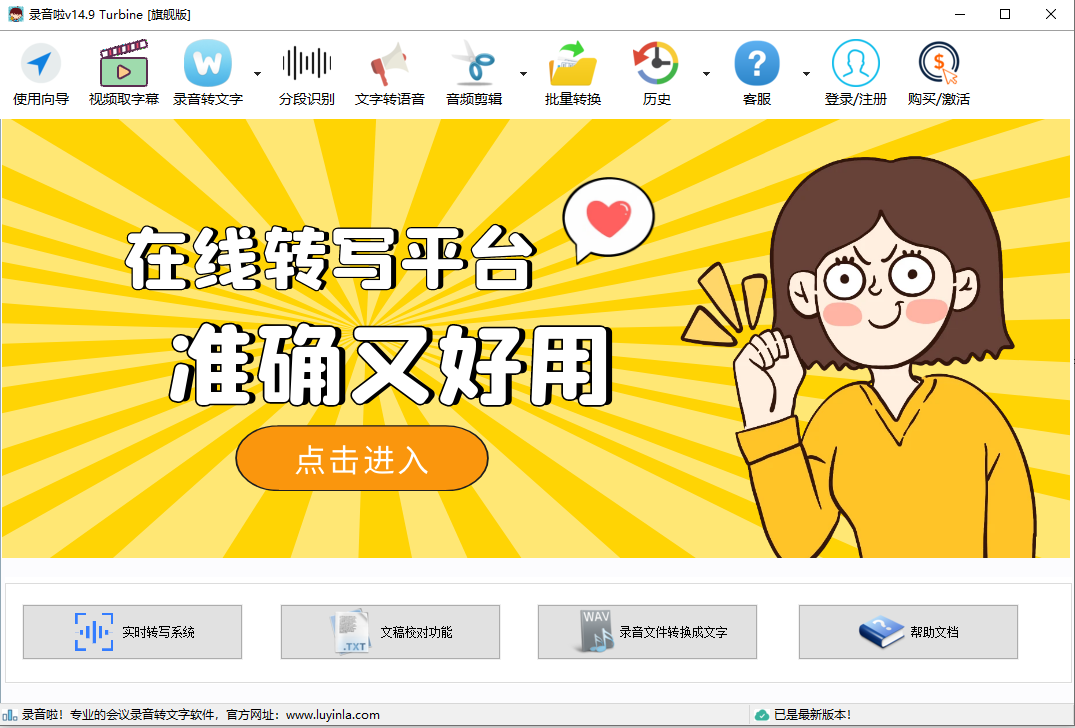 录音啦是一款免费又好用的录音软件,功能超级强大。它有三种语音识别引擎:科大讯飞、百度和云知声,支持多种语言转文字,包括中文、英文、粤语等等。主要功能有录音转文字、文字转语音、分段识别还有字幕制作,方便会议记录和视频添加字幕。