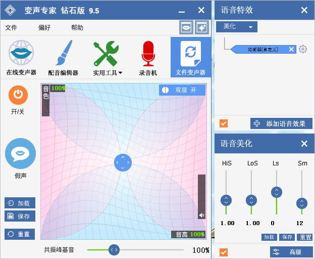 注意: 开启双层(按钮绿色),即可在选择和调节的过程中实时听到自己的声音变化。