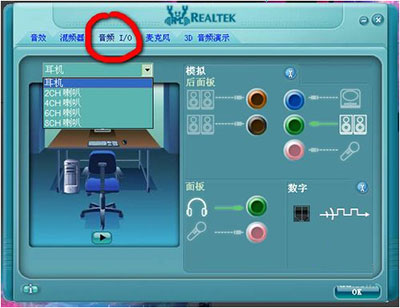 4、在“音频I/O”标签页中。先选择声音输出设备,之后会弹出设备接头设置窗口,如果将设备插入电脑后没有声音的话,可以从此处查看。