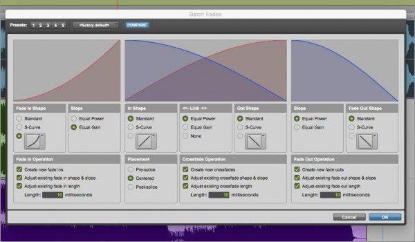 当使用批量淡入淡出(batch fades)时,你可以调整淡入、淡出和交叉渐变的参数。对于不同的工程类型(影视后期或是音乐),你可以对应设定不同的参数。