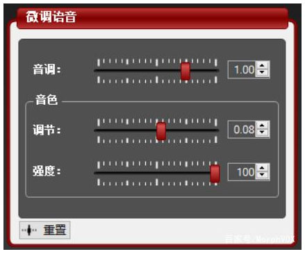 首先来说一说微调语音里的参数设置,微调语音中共分为音调和音色两部分,音色又分为调节和强度两个数值按钮。