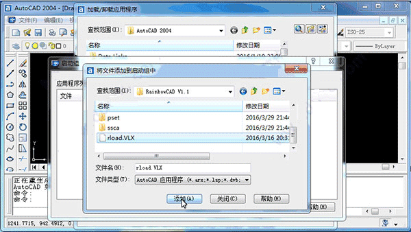 2、启动CAD,把程序文件 "rload.VLX" 添加到CAD启动组,然后关闭CAD 。 仅首次使用需添加。