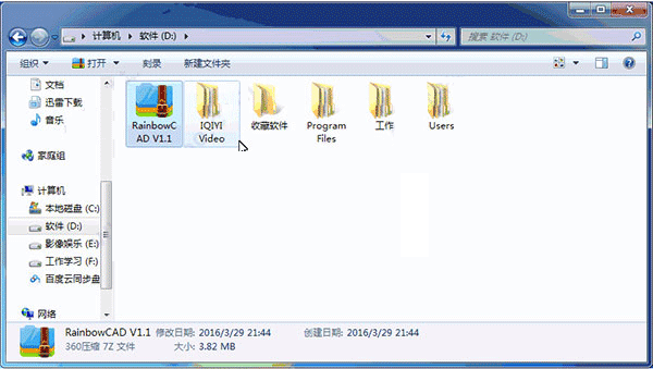 1、解压 "RainbowCAD V1.1" 文件夹于 D 盘 根目录下 。