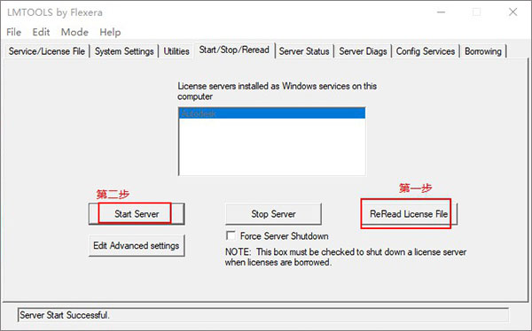 15、点击start/stop/read选项,点击 'rereadlicense file',再点击'start server'启动服务。