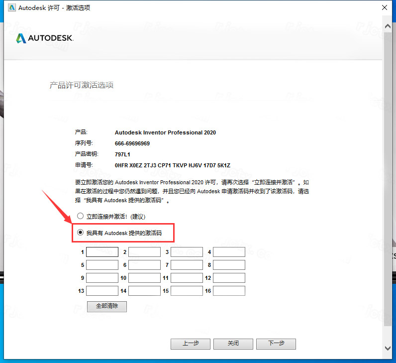 7、选择【我具有Autodesk提供的激活码】(不要关闭此界面)