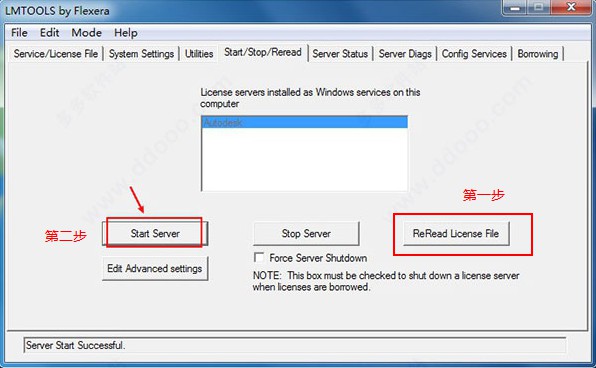 12、点击start/stop/read选项,点击 'rereadlicense file',再点击'start server'启动服务。