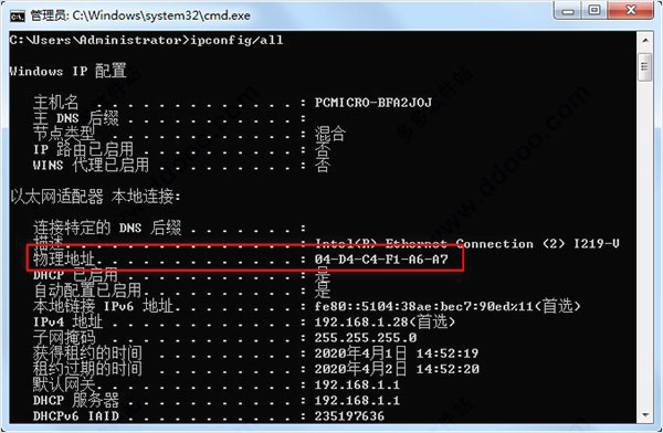 MAC地址:运行cmd,输入 ipconfig /all 获得物理地址【04D4C4F1A6A7】中间的“-”不需要;