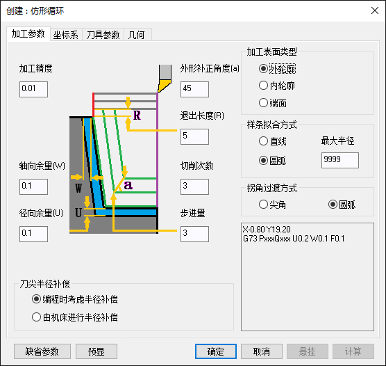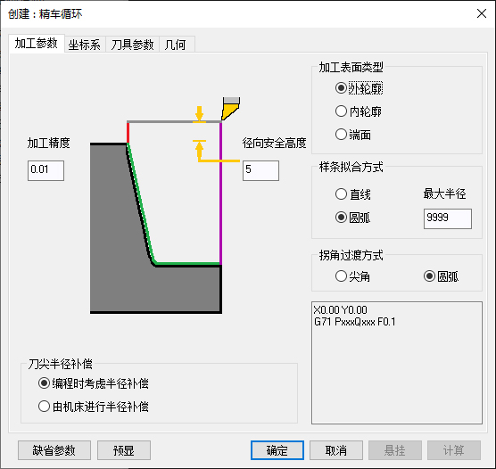 精车循环策略通过设置车削精加工循环参数,生成精车循环轨迹,后置处理可生成对应的精车循环指令代码,方便根据加工精度要求快速修改加工代码,减少零件轨迹编程,提高零件加工效率。