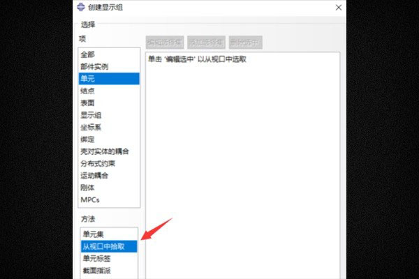 2、在弹出“创建显示组”窗口中,找到下面的“方法”列表,点击“从视口中拾取”。