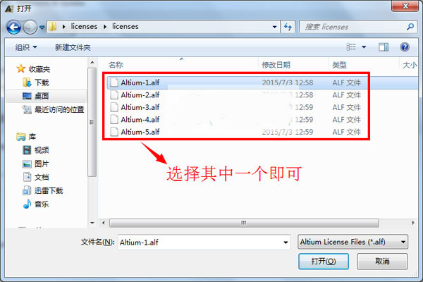 4、下载并将补丁licenses.rar解压并打开,里面有5个文件,选择随意一个文件后点击“打开”。