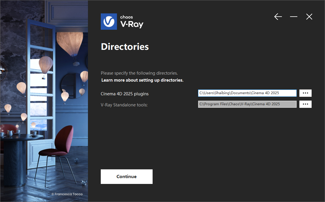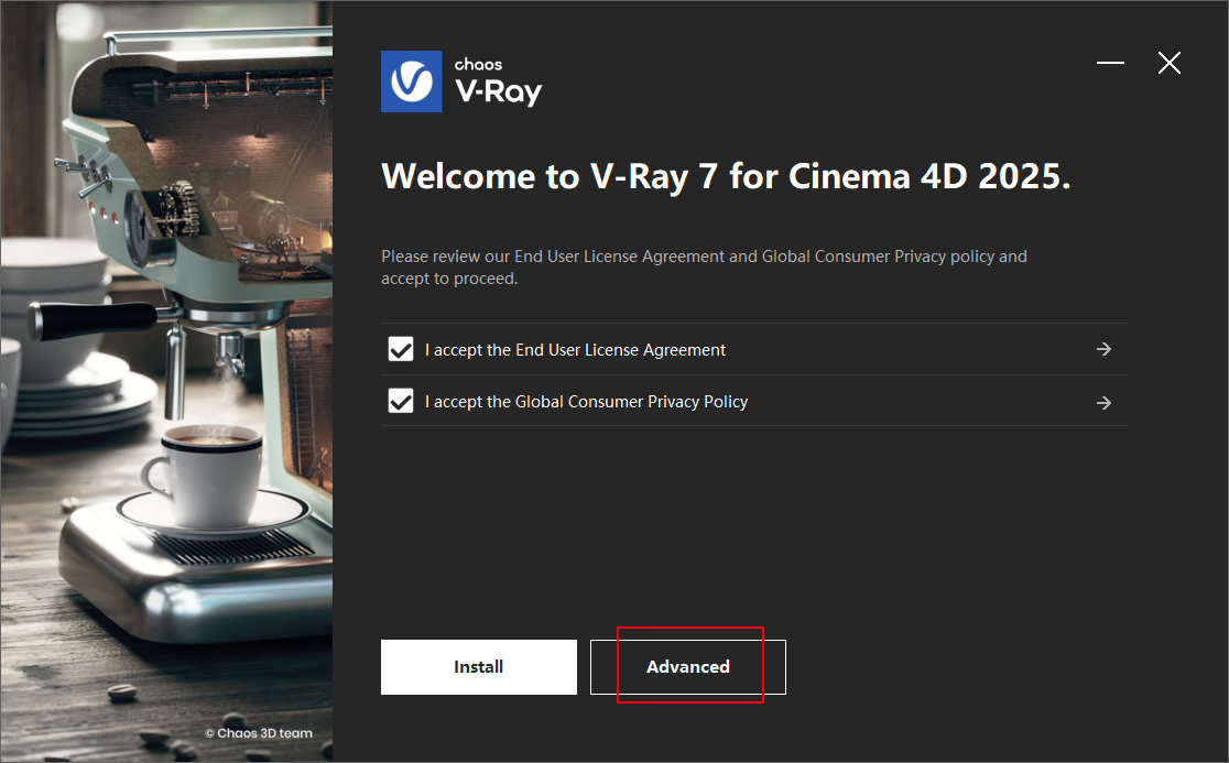 2、以2025版为例,双击文件vray_adv_71001_c4d2025_x64.exe开始安装,接受协议,点击Advanced;