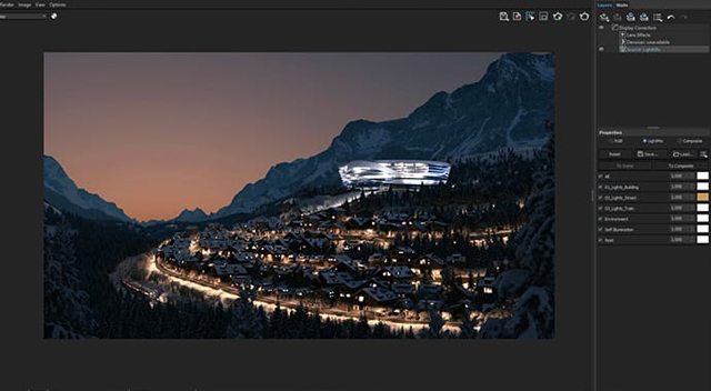 图层合成器可以轻松组合渲染元素,设置图层混合模式,调整颜色,无需单独的后期处理软件。