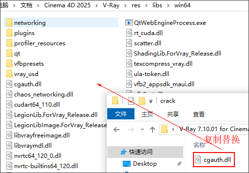 拷贝cgauth.dll到C4D安装目录的如下位置,一般默认目录【C:\Program Files\Maxon Cinema 4D 2025\plugins\V-Ray\res\libs\win64】