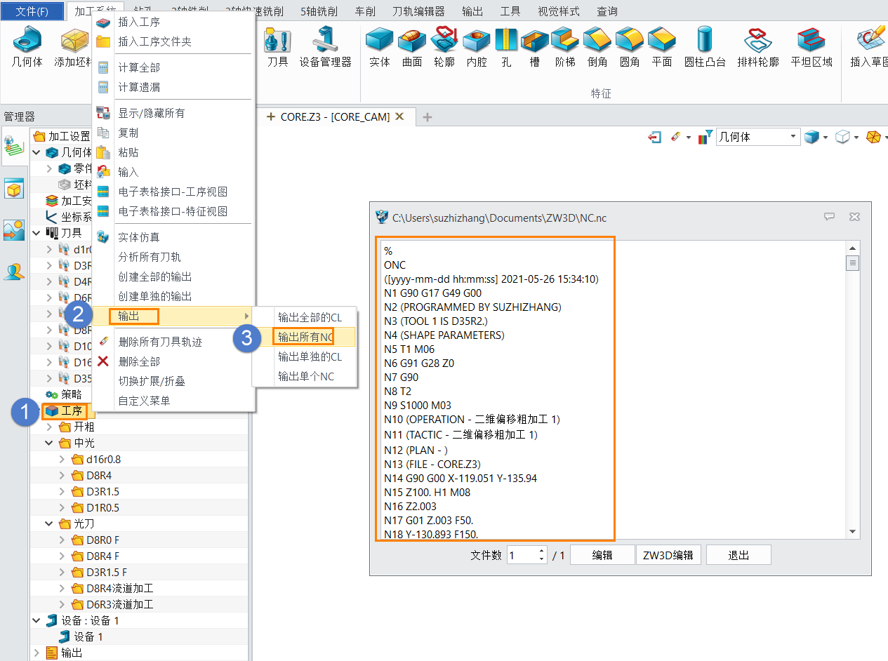 步骤2、输出NC代码。选择所有工序,输出并得到NC代码。也可以单独对每把刀具输出一个NC代码。