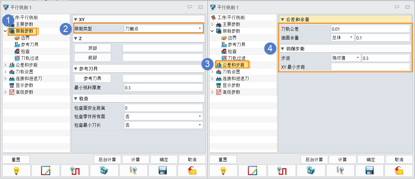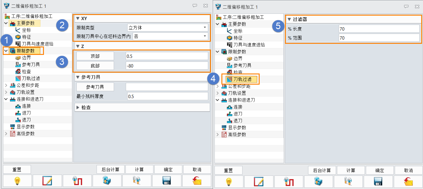 步骤3、设置限制参数。在限制参数中,设置限制类型和Z轴方向的加工范围与刀轨的过滤范围。