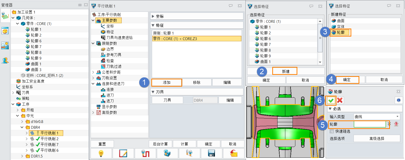 步骤2、添加特征和选择刀具。双击“平行铣削”工序,在主要参数中添加零件和新建轮廓为特征,并选择刀具。