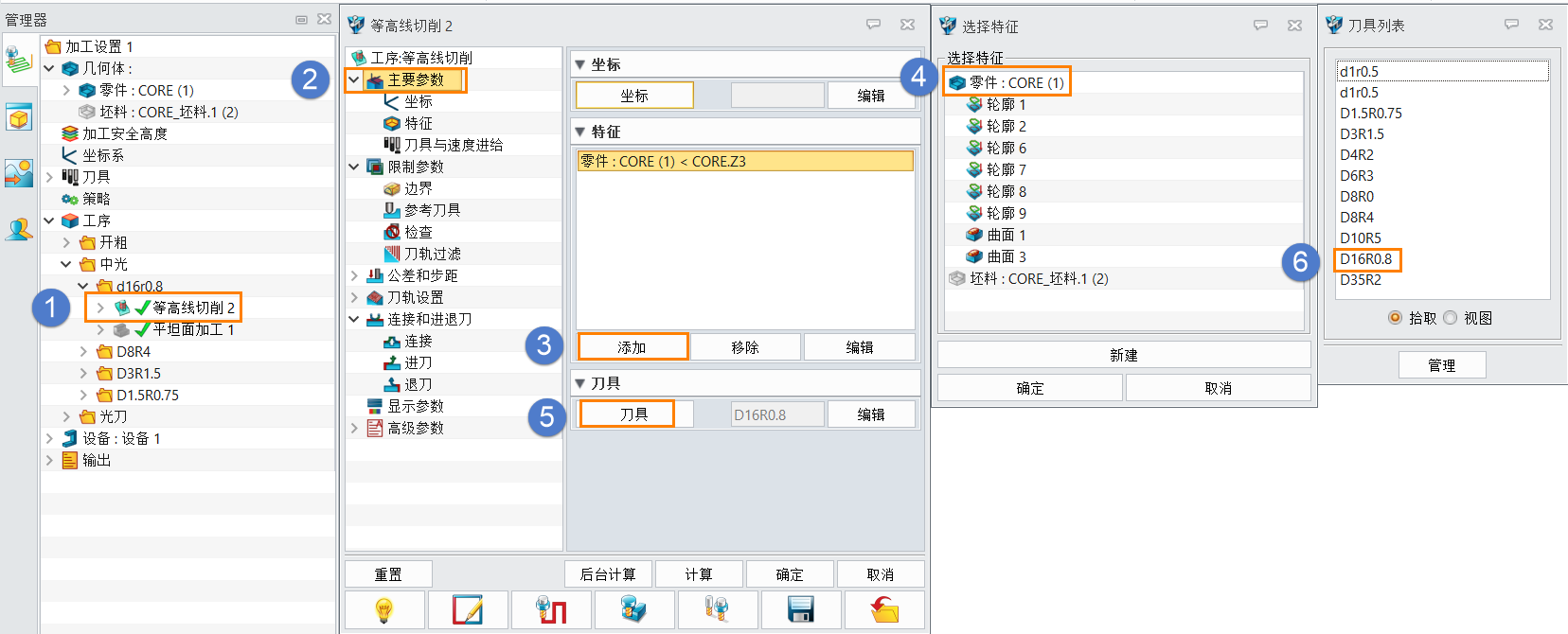 步骤2、添加特征和选择刀具。双击“等高线切削”工序,在主要参数中添加零件为特征和选择D16R0、8刀具。