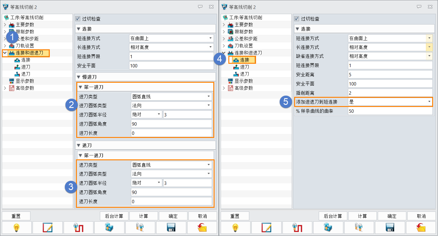 步骤5、设置进退刀和添加连接。在连接和进退刀中设置进退刀方式和添加进退刀到短连接。