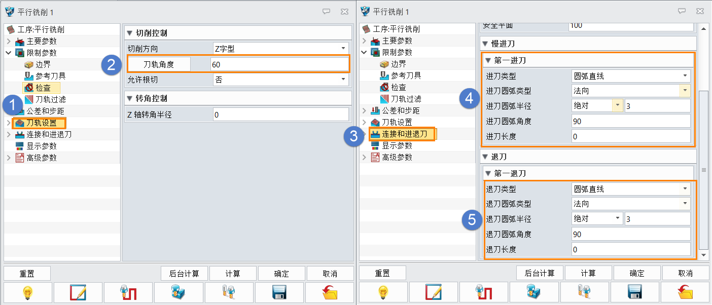 步骤4、设置刀轨角度和进退刀方式。在刀轨设置中设置刀轨角度,在连接与进退刀中设置进退刀方式。