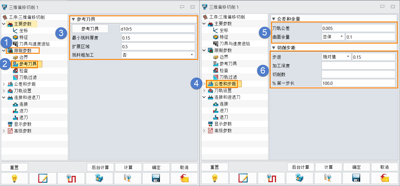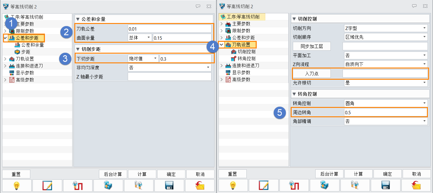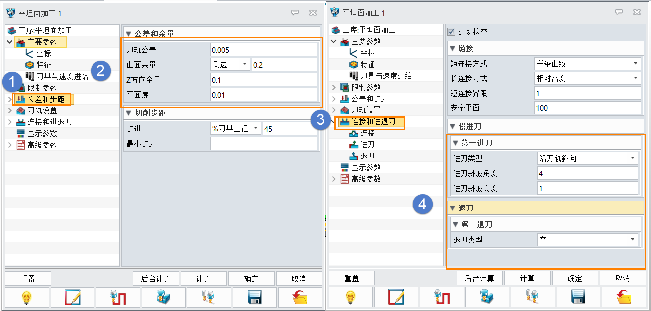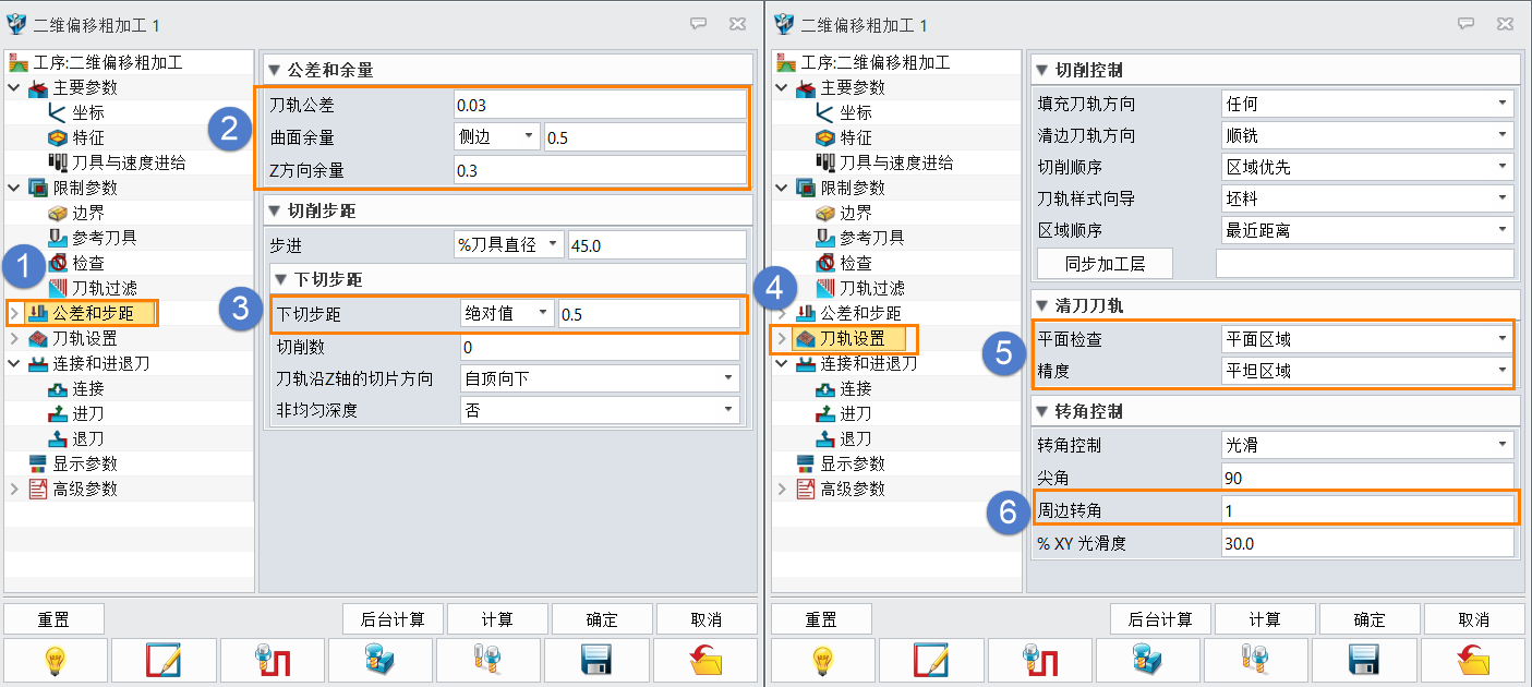 步骤4、设置公差、步距和刀轨。在公差和步距中,设置相应的“刀轨公差”和“余量”,及“下切步距”。在刀轨设置中设置相应的“平面检查”和“精度”与“周边转角”。中望3D 2018的刀轨设置中新增多平面检查功能(如下图第5处),在加工多层平面时无需逐个选择每层平面进行检查,非常快速便捷。