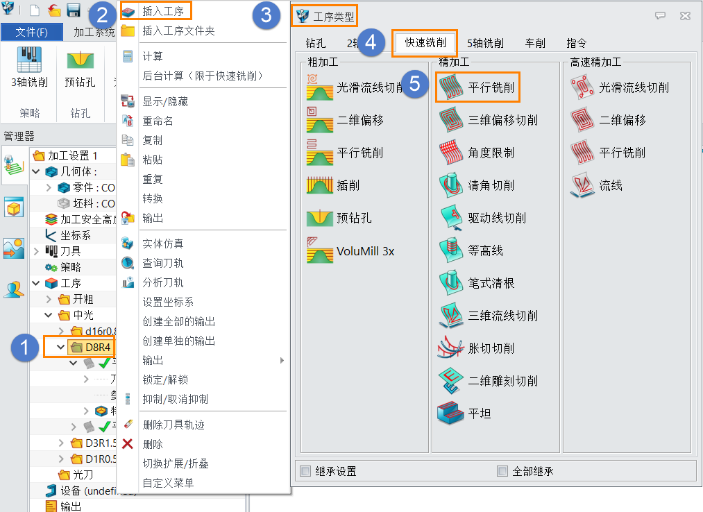 步骤1、插入工序。在加工平坦面时,所有面已经过D16R0、8刀具加工,只剩比较小的R角(R0、5),所以接下来选用D8R4的刀具。右键单击名称为“D8R4”的文件夹,选择“插入工序”,在工序类型中的“快速铣削”选项卡面板中选择“平行铣削”工序。