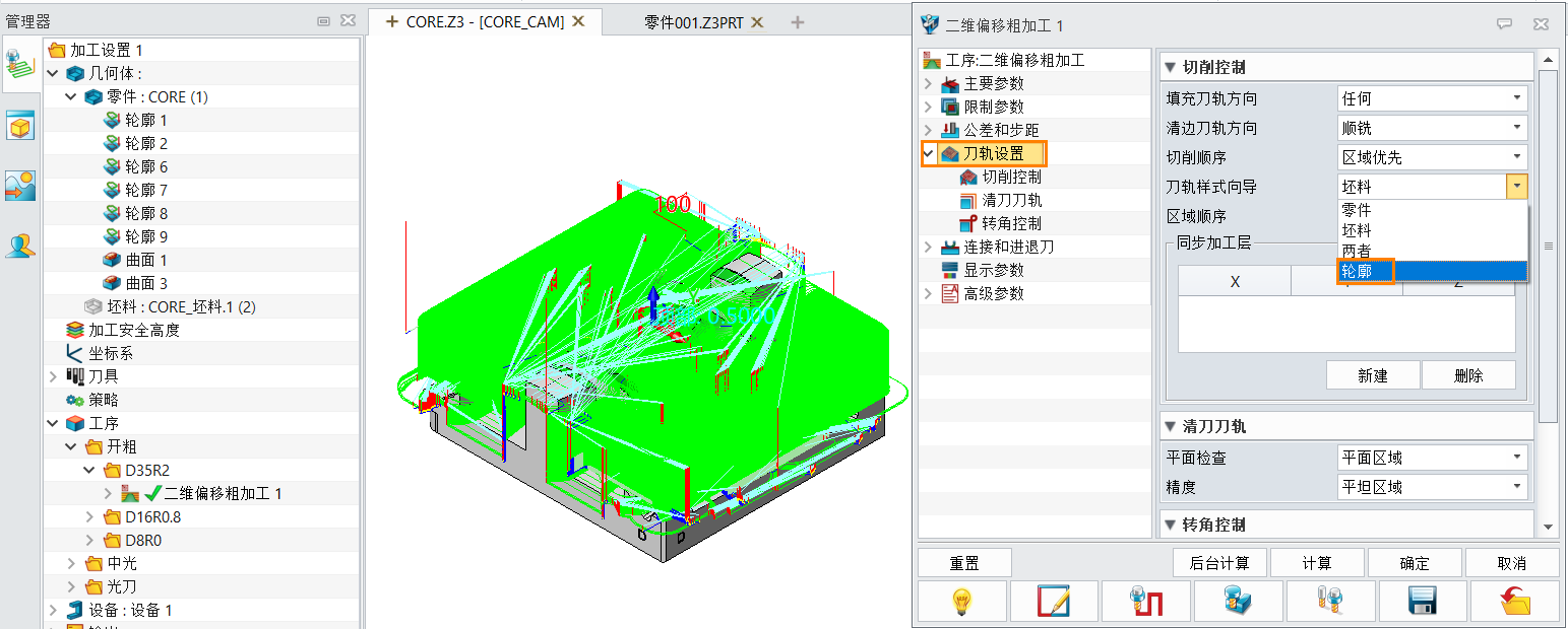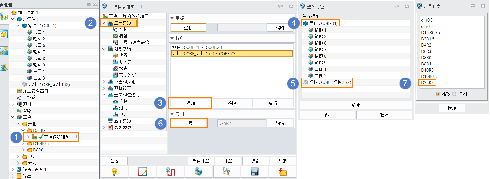 步骤2、添加特征和选择刀具。双击“二维偏移粗加工”工序,在主要参数中添加零件和坯料为特征,并选择D35R2刀具。