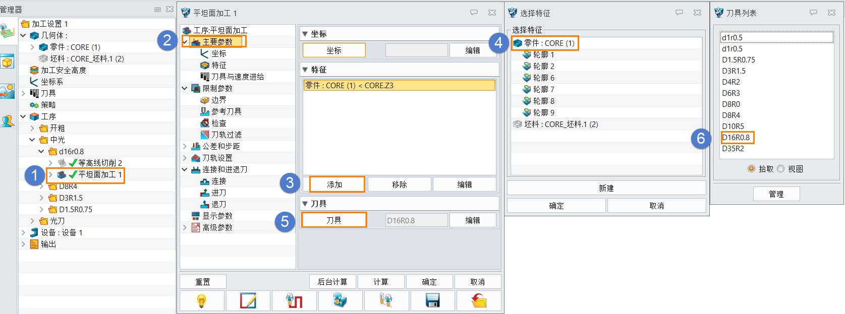 步骤2、添加特征和选择刀具。双击“平坦面加工”工序,在主要参数中添加零件为特征和选择D16R0、8刀具。