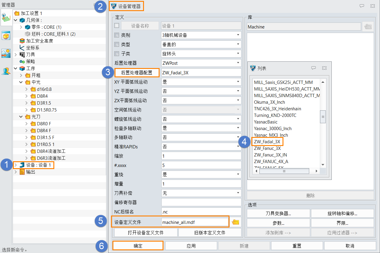 步骤1、选择设备。双击设备,在设备管理器中,点击“后置处理器配置”,在列表中选择相应的“后处理文件”控制器,并设置设备定义文件为“machine_all”后,完成设备的定义。中望3D 2018可支持西门子与海德汉数控系统常用NC代码。