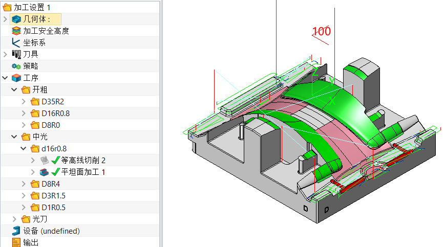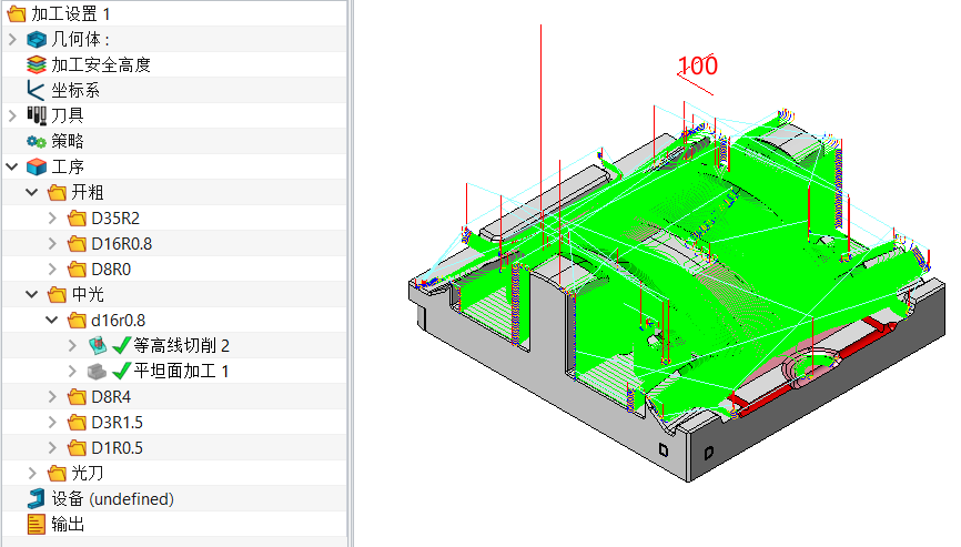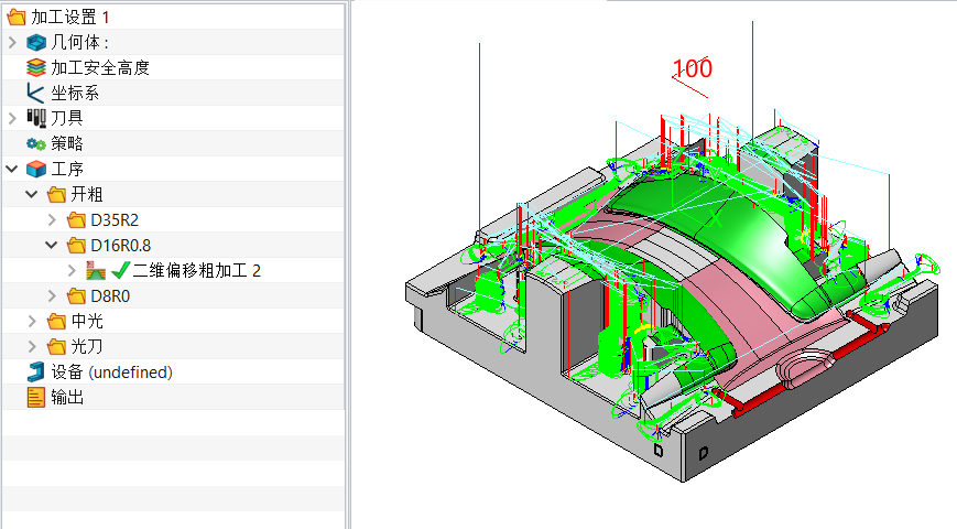 二次开粗主要是在首次开粗基础上,进一步更精确地去除多余胚料,为精加工打下更好的基础。参考上一个开粗工序进行二次开粗,可根据加工零件的形状和上把刀具的大小选择刀具,建议选用半径约为上把刀具半径大小的刀具(此处选择D16R0、8刀具)。