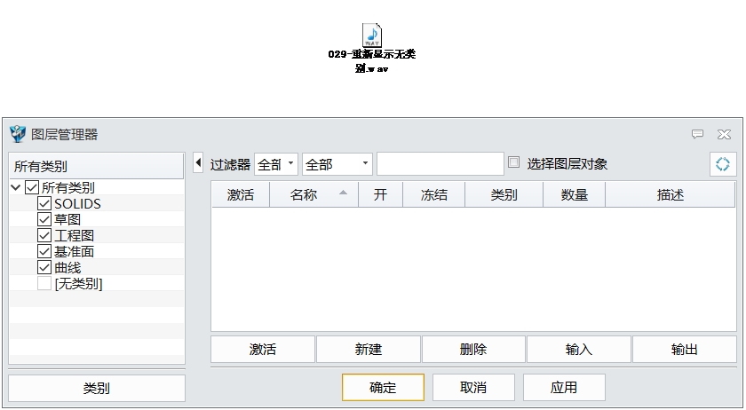 第二步:在类别里,有Solids、草图、工程图、基准面、曲线等5个缺省类别,没有被指定类别的图层,一致被视为无类别,如图2所示,去选无类别,Layer0000图层将即被过滤掉,不显示在图层管理器中。