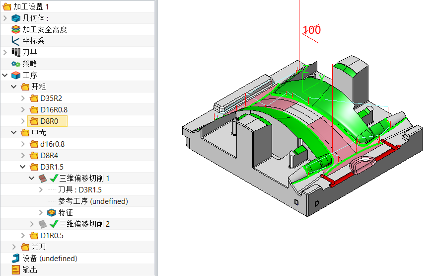 在中望3D中,二次开粗以参考工序为主,重复使用二维偏移粗加工工序,将其添加至参考工序中,更换相应的刀具后,修改公差和步距中的步进与下切步距的参数。具体的参数一般根据刀具半径大小和工程师的经验进行修改设定。此处选用D16R0、8刀具。