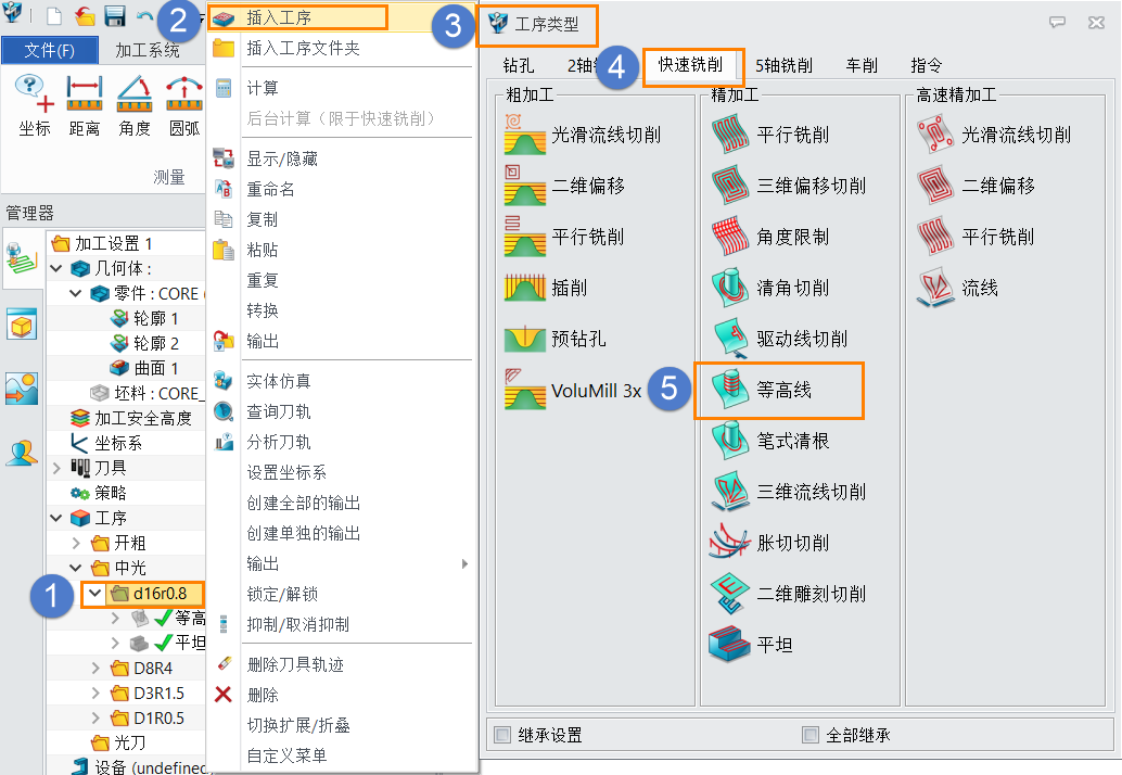 步骤1:插入工序。根据加工零件的形状,半精加工的第一把刀选用D16R0、8的刀具。在名称为“D16R0、8”的文件夹下点击右键,选择“插入工序”,在工序类型中的“快速铣削”选项卡面板中选择“等高线切削”工序。