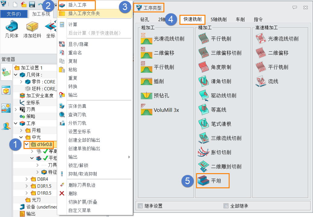 步骤1、插入工序。平坦面加工同样选用D16R0、8的刀具。在名称为“D16R0、8”的文件夹下点击右键,选择“插入工序”,在工序类型中的“快速铣削”选项卡面板中选择“平坦面加工”工序。
