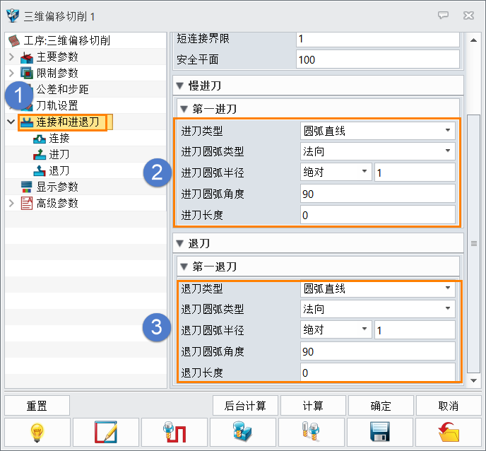 步骤4、设置进退刀方式。在连接和进退刀中设置进退刀方式。