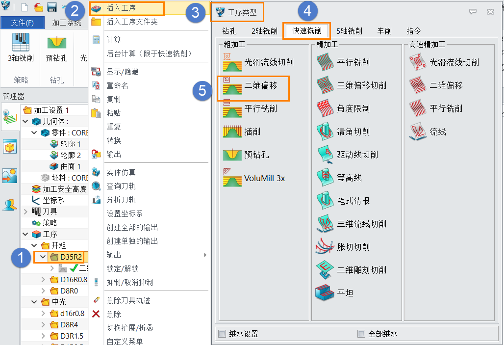 步骤1、插入工序。中望3D在加工中可以使用文件方式管理工序。加工此型芯的坯料大小为250*230*98,因此开粗时选用D35R2的刀具。在名称为“D35R2”的文件夹下点击右键,选择插入工序,在工序类型中的“快速铣削”选项卡面板中选择“二维偏移粗加工”工序。