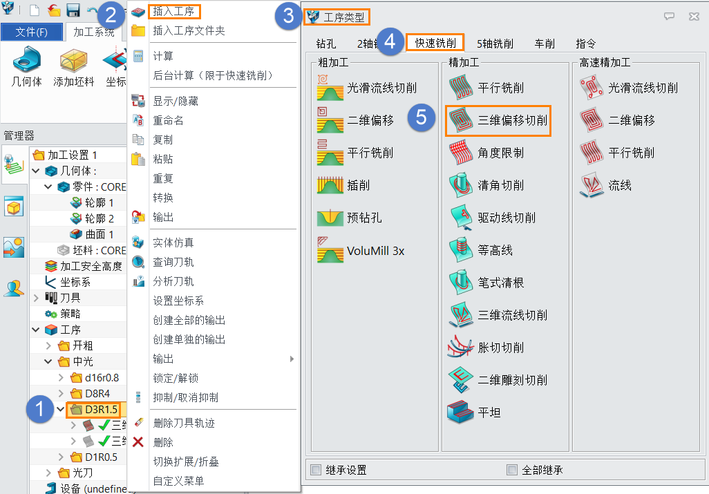 步骤1、插入工序。作为清角刀轨,根据上把刀具(D8R4)选用D3R1、5的刀具。右键单击名称为“D3R1、5”的文件夹,选择“插入工序”,在工序类型中的“快速铣削”选项卡面板中选择“三维偏移切削”工序。