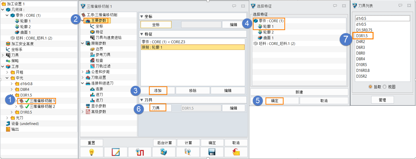 步骤2、添加特征和选择刀具。双击“三维偏移切削”工序,在主要参数中添加零件和轮廓为特征,并选择刀具。