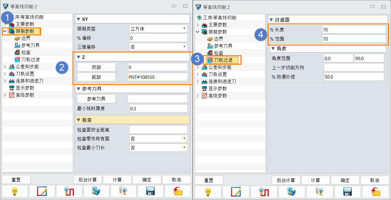 步骤3、设置限制参数。在限制参数中,设置Z轴方向的加工范围与刀轨的过滤范围。