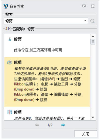 以关键字符匹配搜索,且可记录下每次搜索的内容。搜索对象包括:命令名、命令描述、命令提示语;搜索结果以单页、多页的形式展示,提供翻页和页码显示功能;支持动态展示搜索结果命令所在位置。也可直接执行搜索结果的命令。