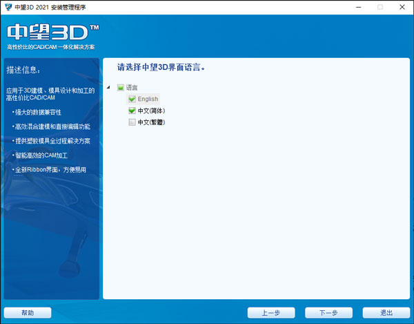 4、进入中望3d界面语言选项,勾选中文简体,点击下一步;