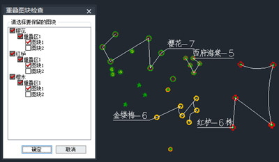 7、乔灌重叠检查:检查图面上是否有重叠的乔灌图块,如果有则弹出对话框可以查看删除重叠的块