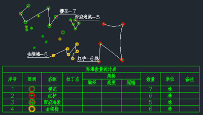 14、更新苗木数量统计表:选择乔灌所在的区域,将区域内的乔灌图块自动更新到已经存在的苗木数量统计表中