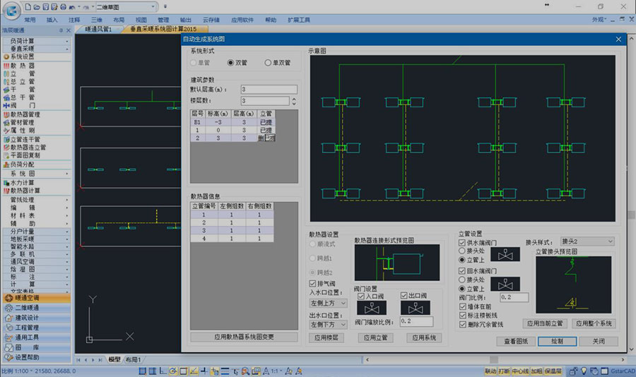 不仅实现平面图到系统的自动生成、实时预览,还提供强大的系统图编辑功能,任意散热器形式的替换、立管的整体移动等功能。