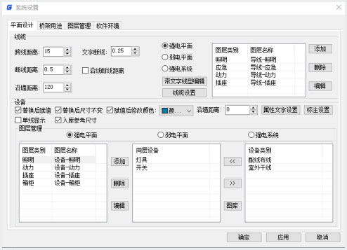 [沿墙距离]针对平面布线—沿墙布线功能的,在此设置线与墙之间的距离,使用命令时,线缆会自动按照距离进行沿墙布置。沿墙距离可以设置为负值,相当于线缆布置在墙内或者墙的另一侧。
